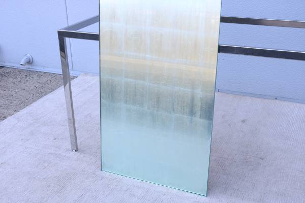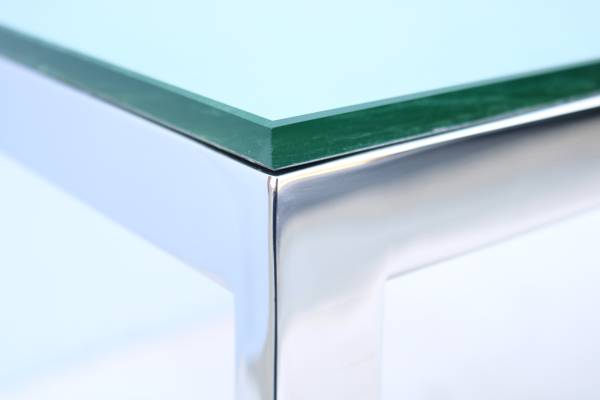 Features a clear glass top with silver leaf sheets on the underside resting on a mirror-polished stainless steel frame.