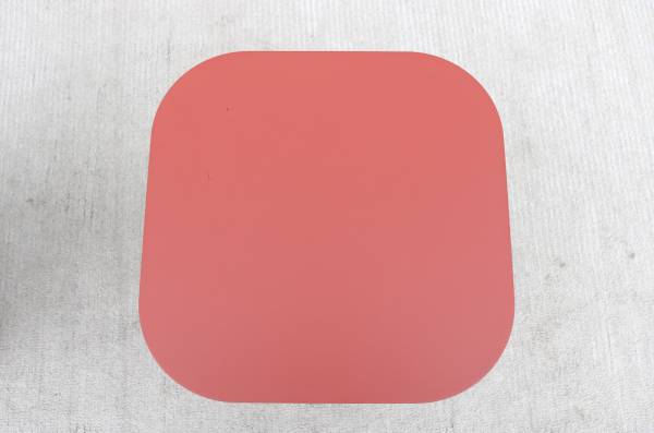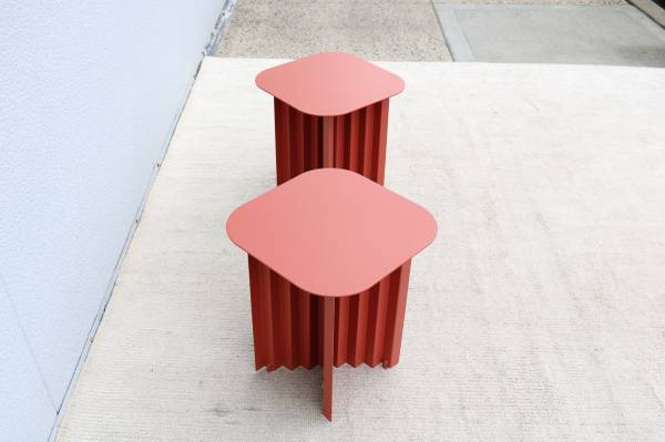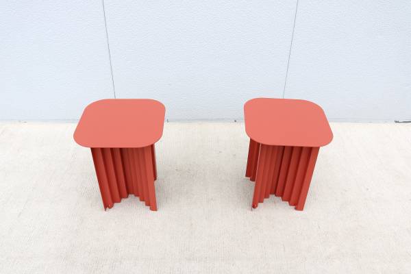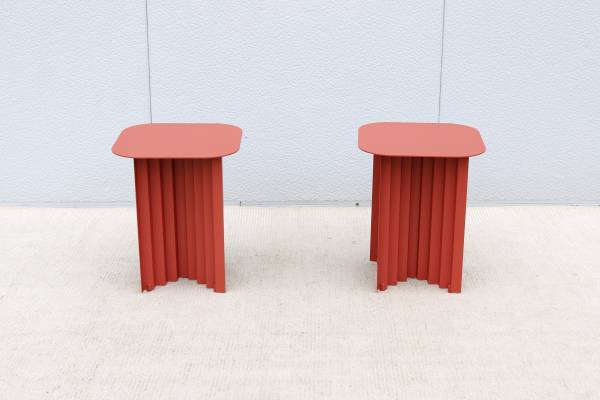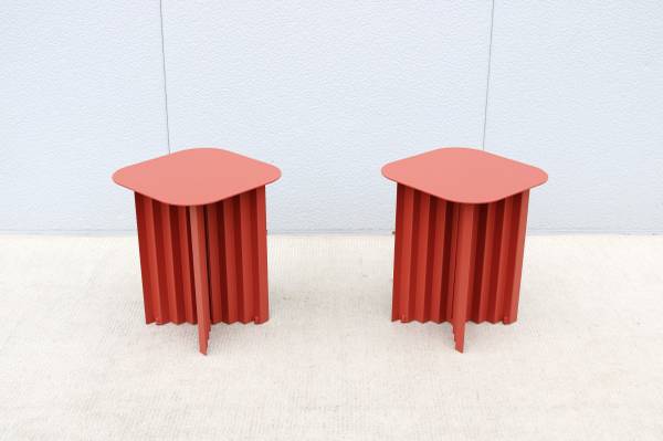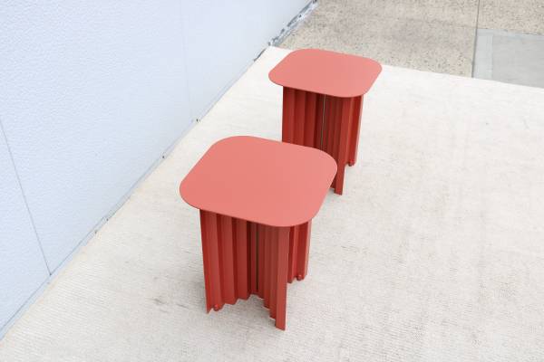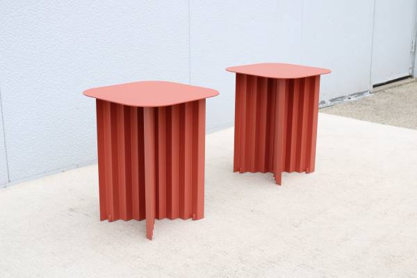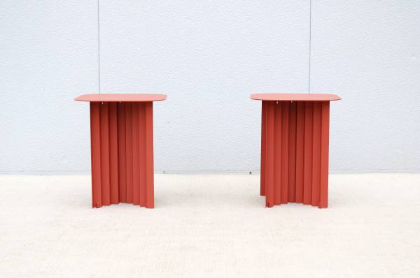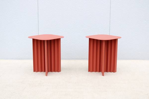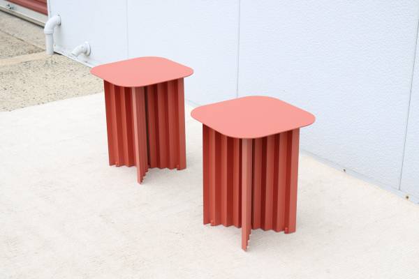 Fabulous pair of Plec steel square side tables in terracotta color, designed by Antoni Palleja Office and expertly crafted in Spain exclusively by RS Barcelona.