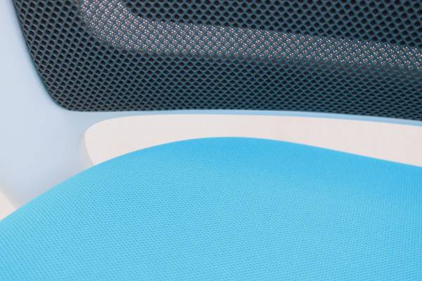 Seat upholstered in blue jay color cogent connect polyester fabric.