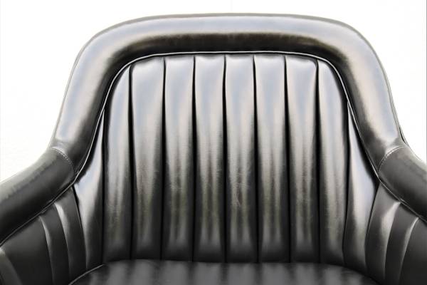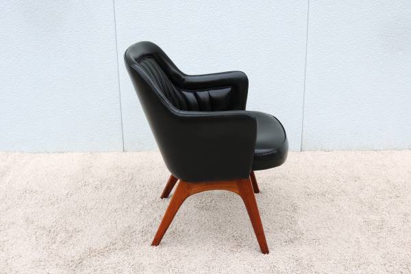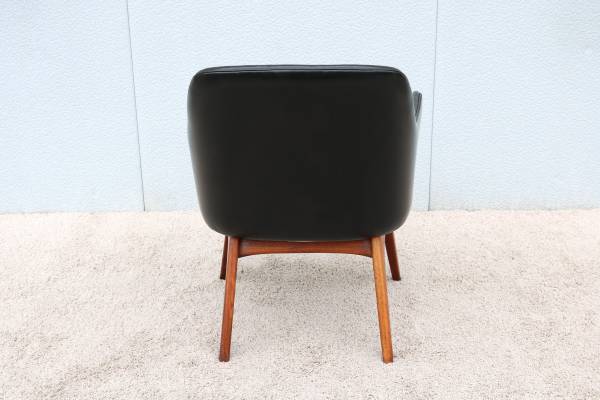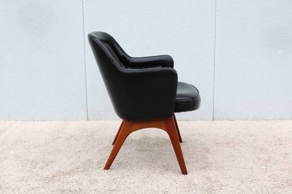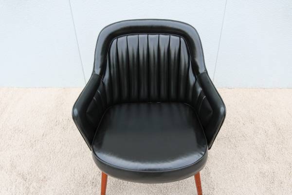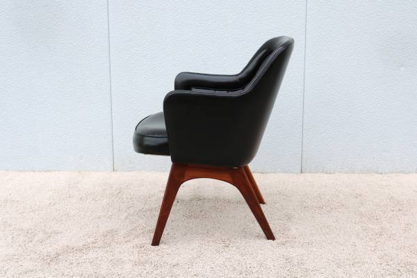 Fabulous vintage mid-century modern black Naugahyde and walnut base executive armchair, in the style of Eero Saarinen and Ward Bennett.