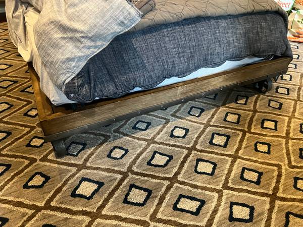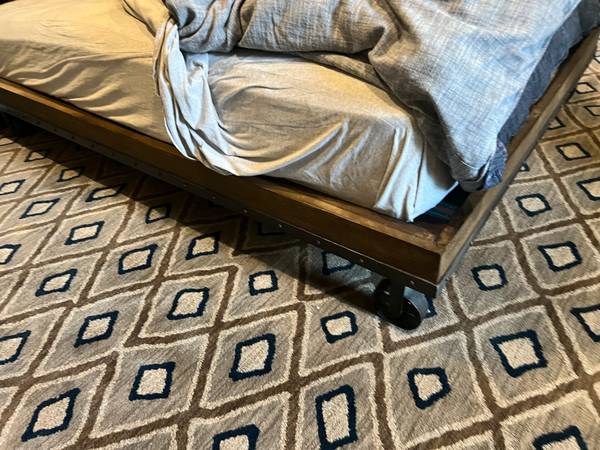 A riveted metal frame and oversized locked cast iron wheels give our platform bed an early industrial-era aesthetic straight from the factory floor.