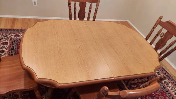Dining room set - 60 x 40 x 29t Table and 4 chairs Pet free home Very sturdy! A few minor blemishes. Base separates from table top to make transport a little easier. Can assist with local delivery...