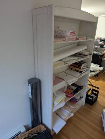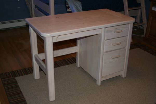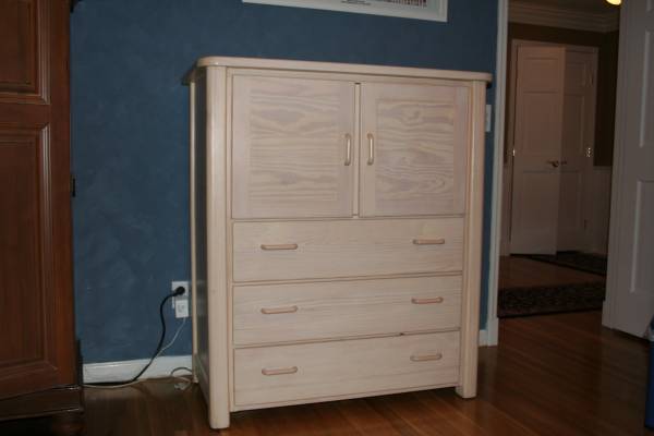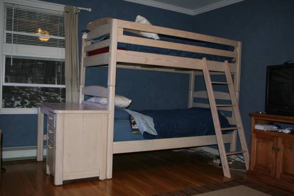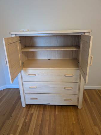 Taken apart for storage....Bunk beds and all furniture...white washed wood in fair to good condition. Includes mattresses