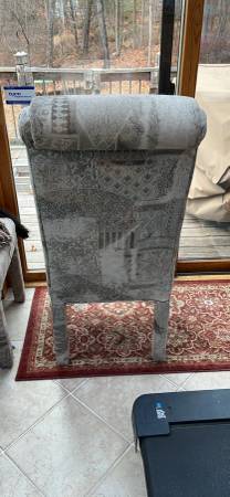 Gray/Tan upholstered dining chairs with a patterned fabric. Padded seat and backrest. Chairs were special ordered from Fortunoff for $250 each. Good condition.