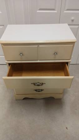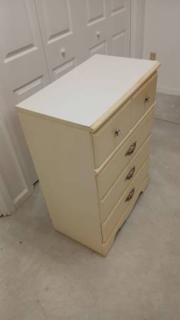 Very quaint White dresser. It is quite heavy and sturdy. Let me know if you have any questions! If your interested, check out our other posts for cheap solid furniture!