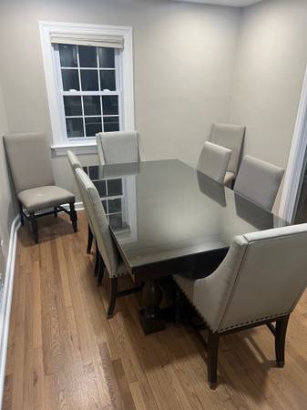 Beautiful 8-chair dining room set in excellent, lightly used condition. The table has a rich dark wood finish and comes with a custom-made glass top (cost $400) that protects the surface and gives it a sleek look.