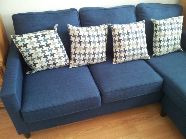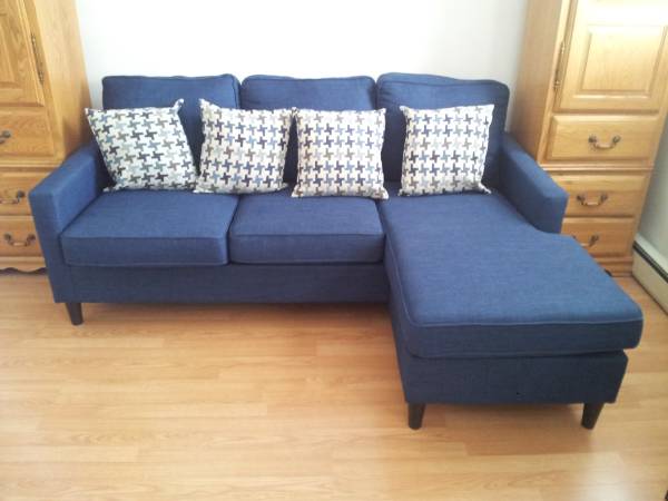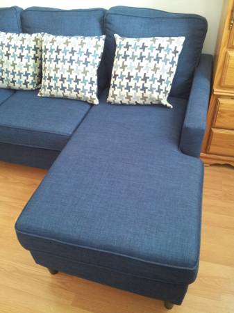 Like New 75” Chaise Living Room Sofa L Shaped Living Room Couch in Eternal Blue with Reversible Chaise and Matching Pillows. The Chaise can be installed on either left or right side of couch. The couch measures 75”W x 25D. The Chaise measures 55” long. If the ad is up the couch is available, so no need to ask. Reply with phone # and I will contact you to coordinate. Cash only. Pick up only in Guttenberg, NJ. Can assist with loading it into your vehicle if need be. Thanks!