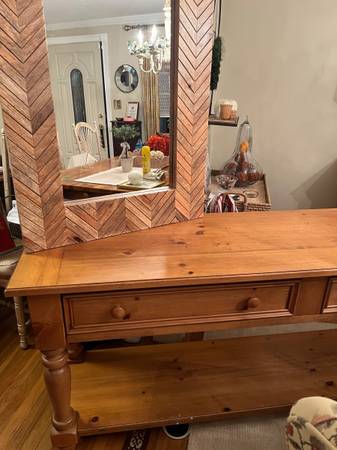 Made by Lane , this farmhouse style solid wood buffet is timeless … vintage from the 80’s… features a 2 large drawers , and a bottom shelf!! Includes a Brand new mirror , all ready to hang …Goes...
