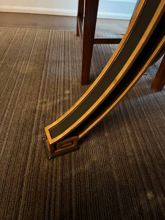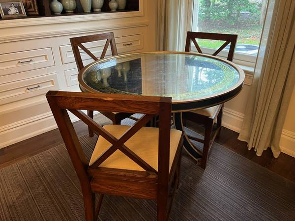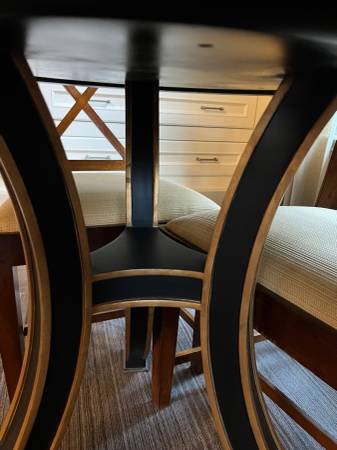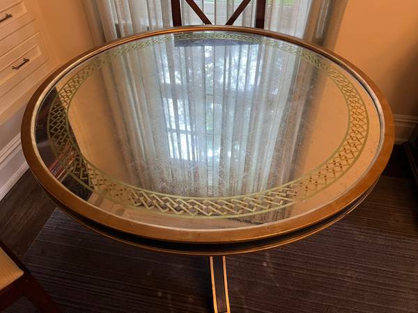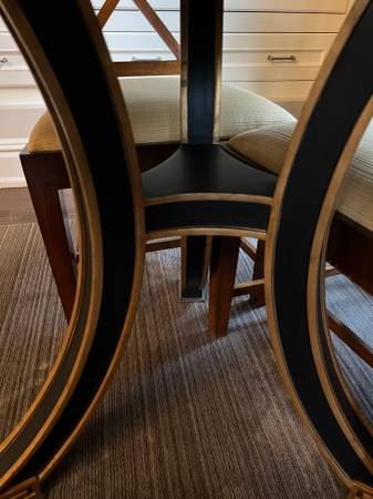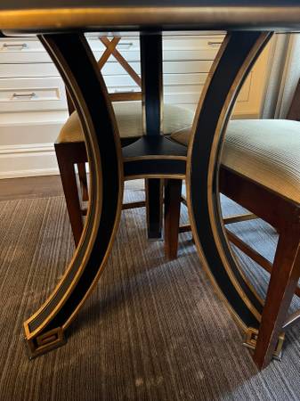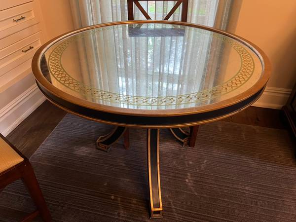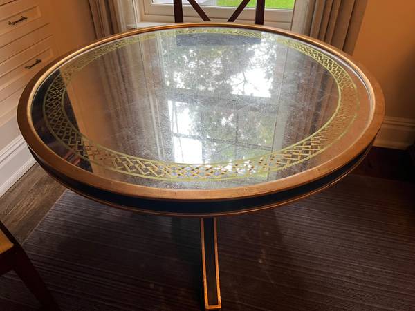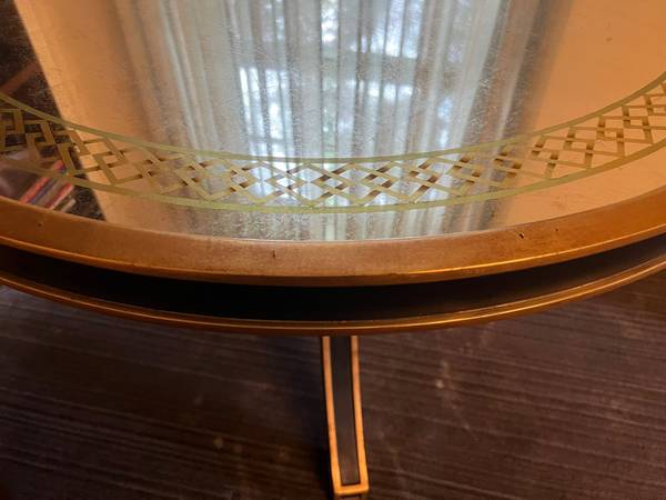 Reverse Painted Mirrored Black Center Table with Gilded Moldings by Julian Chichester Black Wood with Gold Elements 39.5” diameter x 30”h a few nicks Chairs sold separately Smoke free household