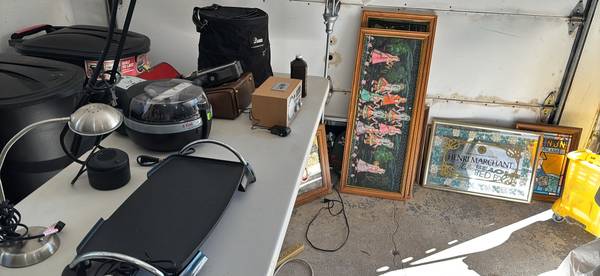 Large Garage Sale Artwork, Purses, Small Appliances, Housewares, Children’s Books, Antiques, Collectibles, Bric-a-brac, Furniture. something for all
