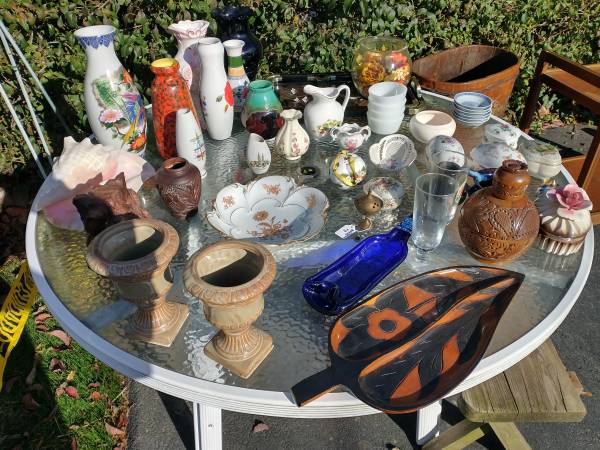 Part of an estate sale. Lots of hand tools, machinist tools, power tools, auto repair tools, plumbing tools, hardware, electrical items, small kitchen appliances, dinner ware, pots, pans, room humidifier, decorative items, pictures, framed prints, paintings, grape press (yep!), electric tabletop grinder and attachments, wet dry vacuum, racquet ball equipment, wire outdoor plant holder, large outdoor Christmas wreath, new VHS tapes, etc ..NO CLOTHES OR TOYS.