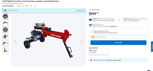 Craftsman 13-Ton Gas Log Splitter 208cc Briggs & Stratton Engine/13 Sec Cycle Time Built-In Cradle\Splits Horizontal Only/Vertical Storage **New**FlrMod**NeverUsed** Reply to post or call...