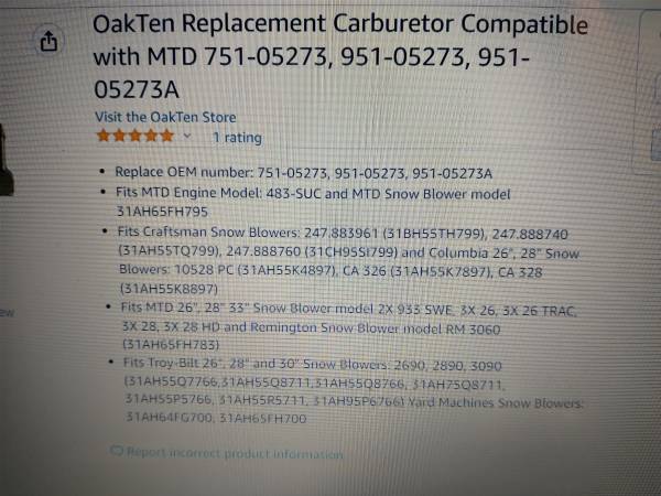 Carburetor Compatible with MTD 751-05273, 951-05273, 951-05273A