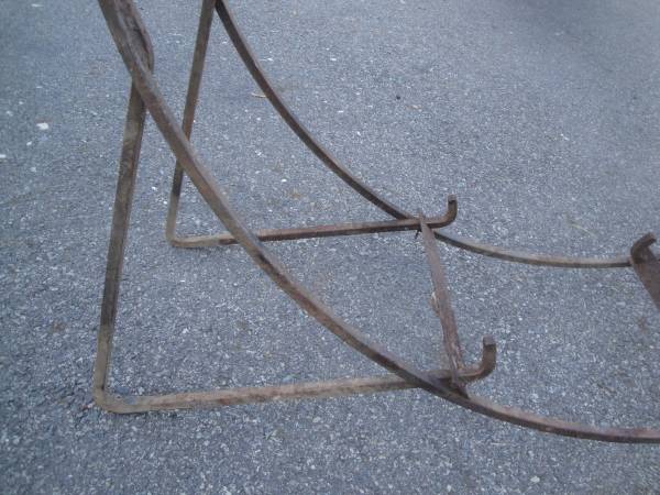 TOP QUALITY AND VERY BIG AND HEAVY! Solid wrought iron bars form this large log holder which is for interior or exterior use. Height is 52". Diameter of the hoop is 46". Depth is 19". Holds a lot of logs securely. NOT THE FLIMSY LOG HOLDERS MADE OF HOLLOW METAL PIPES!