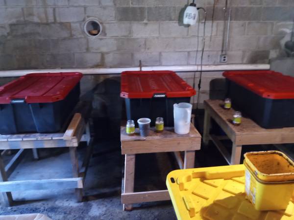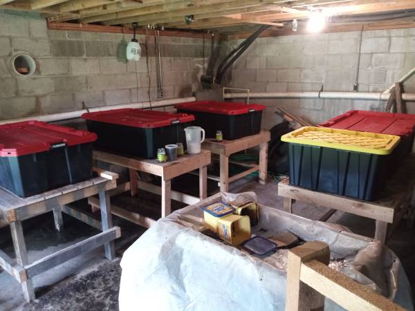 5 large breeding bins ,6 tables hand built,multiple smaller bins atleast 10.Also included two hand built sives for compost and material screening.One has vibrating table other is hand siv. worms are tucked in bins and breeding away about 1000 european night crawlers ,