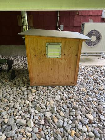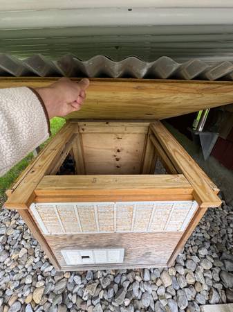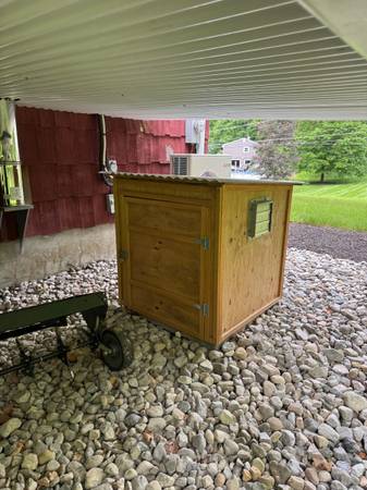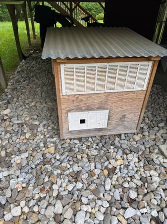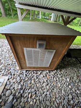 Pressure treated wood and hinge top galvanized metal roof. Built to last. Has vents with mesh and a gable vent fan that runs off your generator power to keep temps down while running.