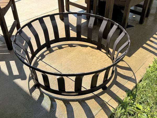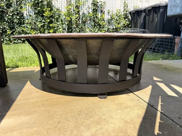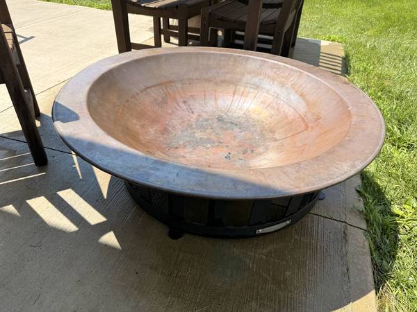Autumn is here. Wouldn't you love to sit outside and enjoy a beautiful fire in your own Fire Pit. This one has a COPPER basin so it will never rust. Look at these fire pits at Frontgate.com They are over $600.00 Now you can have your own beautiful fire pit that will last many years and bring you and your family/guests so much warmth and joy. This fire pit measures 40" across the top and the bowl is 32" across. This comes with the base, the copper bowl insert, and steel wood grating to hold up your firewood when burning. This is an amazing deal. The price is firm. *All sales are final, As-Is, No Returns*