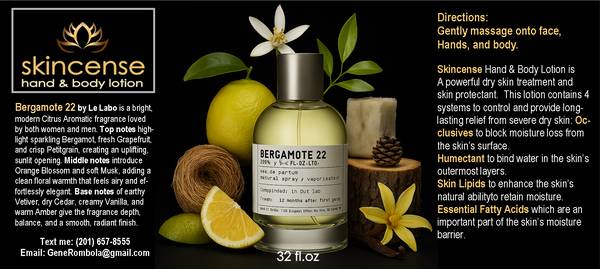 Skincense’s Bergamote 22–type lotion captures the bright, sunlit freshness of Le Labo’s iconic citrus creation. It opens with sparkling bergamot, juicy grapefruit, and crisp petitgrain, creating an energizing burst of clean citrus. Soft orange blossom and airy musk add a smooth, floral warmth that feels effortless and modern. As it settles, earthy vetiver, dry cedar, creamy vanilla, and warm amber create a balanced, radiant finish that lingers beautifully on the skin.