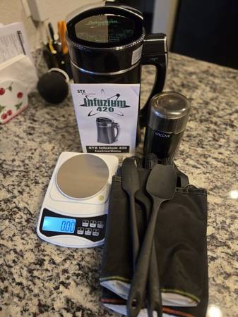 For sale is a STX INFUZIUM 420, an electric herb grinder, a very accurate scale, liquid mesh filters and accessories. Although lightly used, they are always kept in like new condition. This is a great way to make your own healthy edibles for a fraction of the cost of new!