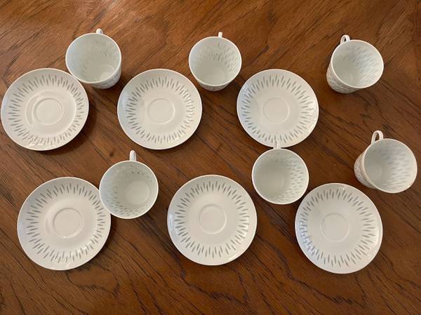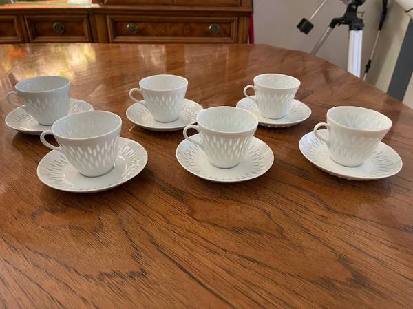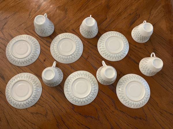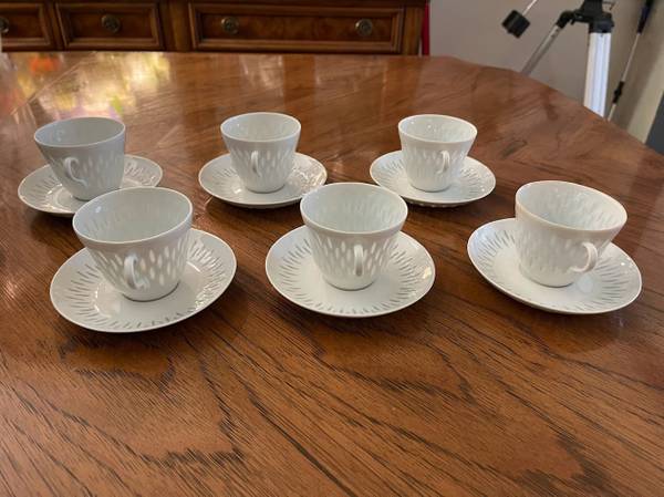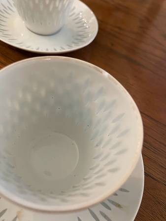 Condition: Set is absolutely beautiful, but the one cup does have a slight chip on the rim as seen in the pictures. The saucers and the outside of the cups are in beautiful like new condition. There are a handful of small imperfections on the insides of some of the cups. I’m not sure if it’s from the manufacturing process or something that happens over time, but it almost looks as if whatever is making the rice grains translucent chips over time. Not the actual cup, but the glaze??? Hope that makes sense. Overall, I would still say they are in beautiful condition!!