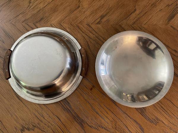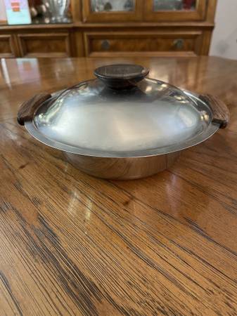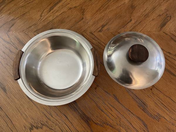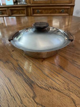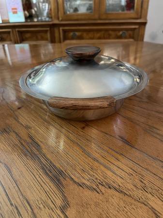 Condition: Good (Structurally it’s in perfect condition, but it does have normal scratches and aesthetic wear for its age) Dimensions: Approximately 9.25” across (including handles. 2.25” high (not including lid), 3.75” high (including lid) Material: Stainless Steel - Handles appear to be wood
