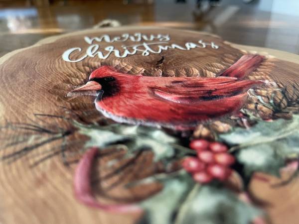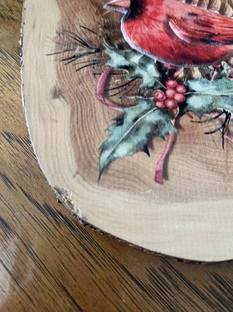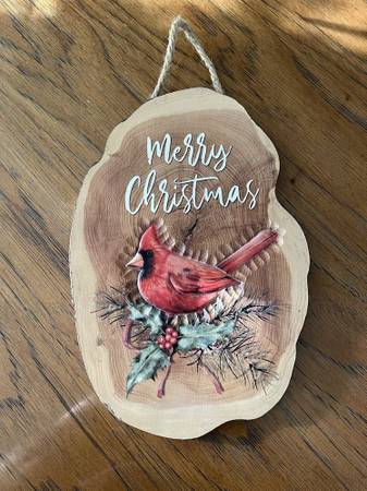 Hanging Merry Christmas Wooden or Wood Like Plaque with Cardinal Bird and Holly Theme