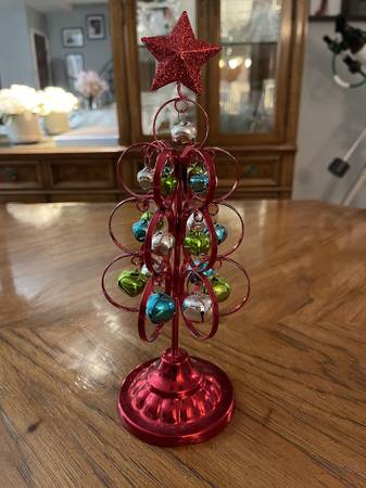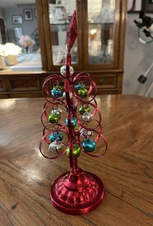 10.5” Red Metal Christmas Tree Decor with Colorful Dangly Christmas Balls
