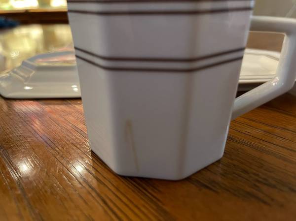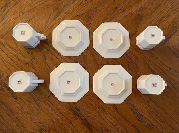 Beautiful condition: There are some very minor flaws if you are really looking for them including what appears to be 2 drip stains on the sides of 2 of the cups (see pictures). If you are really really looking under a light, you can see some minor scratching on the plates and undersides, but overall, they are in very beautiful condition, excellent to almost like new!!