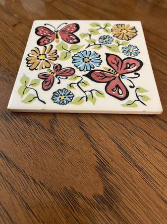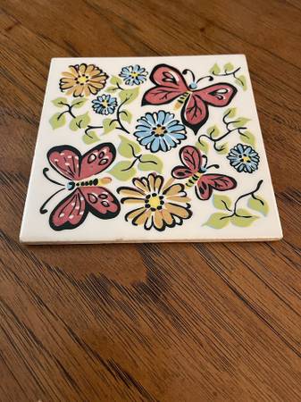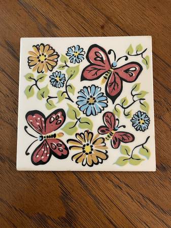 Butterfly and Floral Ceramic Tile Wall Art Piece or Trivet - See Description - Likely Vintage