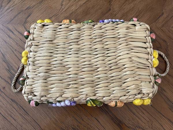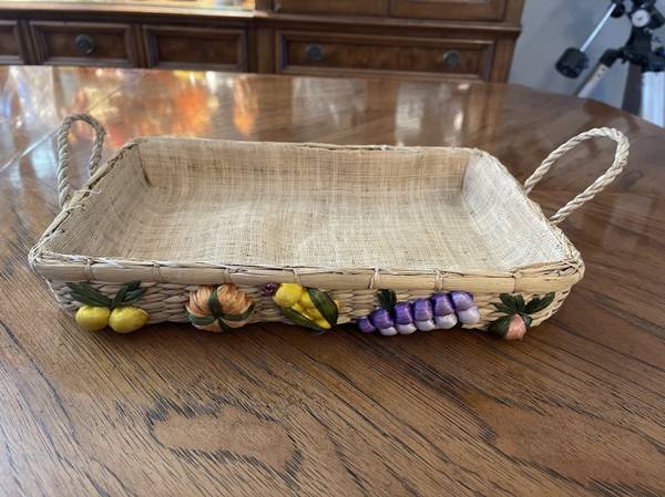 Dimensions: Entire length of basket (not including handles) is approximately 13” long x 8.5” deep x 2.5” high (measuring from the outsides of the basket but not including the protruding decorative vegetables)