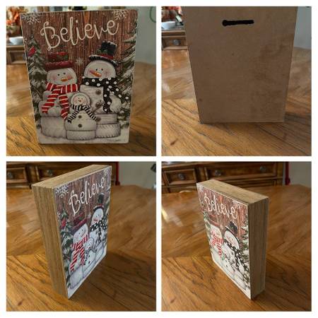 “Believe” Wooden Box Christmas Decor with Adorable Snowman Tire Family