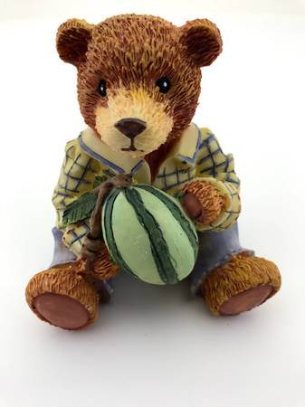 Super cute bear figurine holding a watermelon. Approximately: 4.5" tall, 3.75" wide, 3.5" deep.