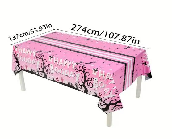 Two Halloween Paper Disposable tablecloths. Orange Jack O'Lantern AND Spooky Pink Boo Tablecloth. Orange is: 86" x 54". Pink Boo is Large: 108" x 54". Pink Boo is laminated paper. Table Cover for Halloween Parties, Dining Tables - Easy-Clean Paper Material. Perfect for Home, Events, Photo Backdrops - Halloween Decoration.