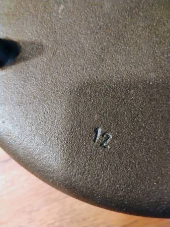 A pre-owned 7 Qt Cast Iron Dutch Oven/Kettle/Camping Pot with lid. handle and feet. Stamped '12'. Heavy gauge cast iron. See pictures. About 11.5-inch inner diameter X 4.74-inch inner height. About 14-inch outer diameter and 5.5-inch outer height without lid. About 7-inch tall with lid. It is pre-seasoned.