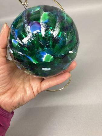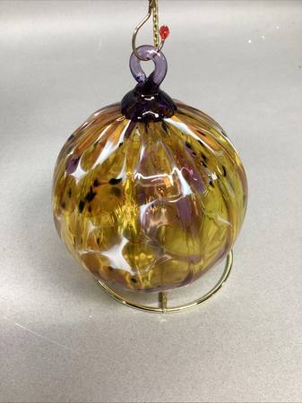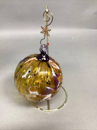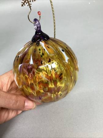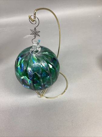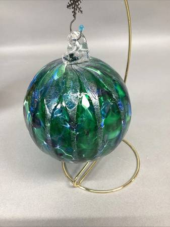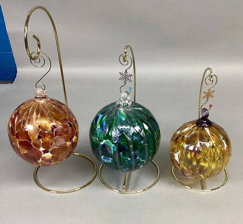 Set Of 3 Hand Blown Glass Christmas Ornaments With Ornament Hangers. These are in good condition. The green one measures 4.25”D (not including the topper). The orange red and yellow one is 4”D and the yellow one is 3.25”D. Measurements are approximate. The 3 ornament hangers heights are: 10.5”, 9” and 8”.