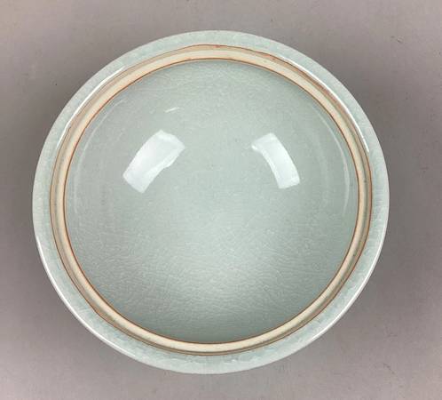 This is a light blue pedestal serving bowl with a lid. The lid has holes in it to allow food to vent. It also has a silver frog on top to serve as a handle to lift the lid off the bowl.