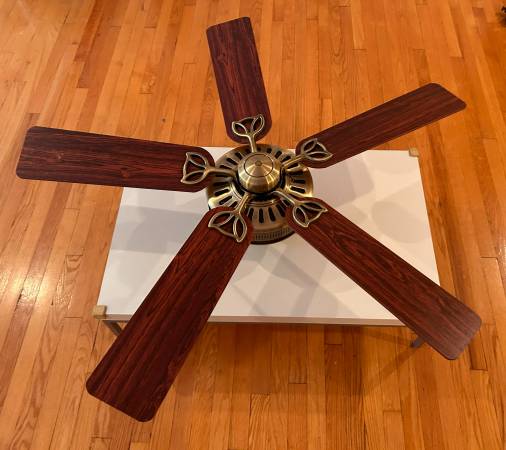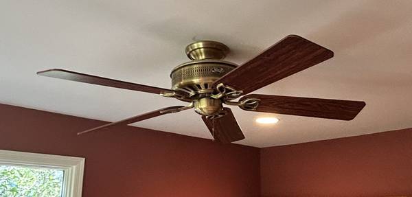 Ceiling fan with 5 blades. Reversable switch. Approx 51” diameter, each blade is 21 ¼” long, each blade to the bottom round base is 23 ¾” long, 11 ¼” from ceiling base to the bottom of the round...