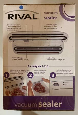 Rival Vacuum Sealer model FSFGSL0100-015 in sealed box, as it has never been used. 3 steps 1) Place item to be sealed in bag. Then place open end of bag into vacuum through. 2) Close lid, then press down to start the vacuum process. 3) Indicator lights monitor the vacuum and sealing progress.