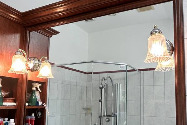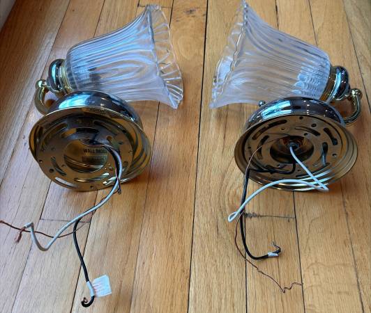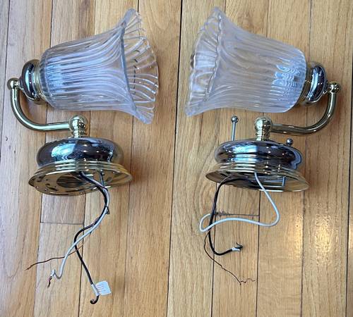Twin scones on wall mounted light fixture. Gold color. Comes with the two shades shown in photo. Approx 5” L x 7 1/2” H x 8” D. Missing 1 screw and the two round decorative screw caps.