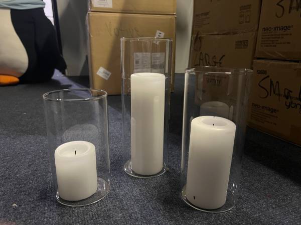 Yummi pillar WHITE candles & cylinder vases (burned for ~6 hrs) - Paid $600 - asking $300 36 tall - 9" 28 medium - 7.5" 35 small - 6" ALSO available Votive candles 133 white candles in vases...