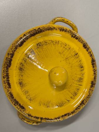 New, never used covered casserole serving dish with lid, measuring 8 1/4" D.