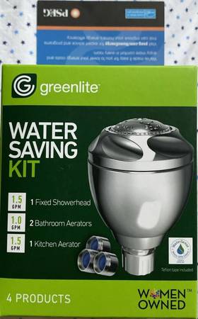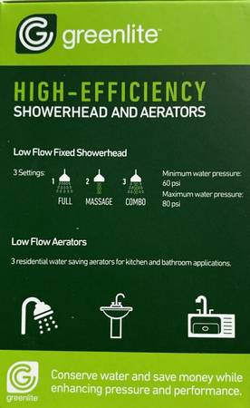 This kit includes a high-efficiency low-flow showerhead with 3 spray patterns, a kitchen aerator, and 2 bathroom aerators, all in a sleek silver-chrome color. With a power rating of 1.5 GPM, this showerhead is suitable for use in the bathroom, kitchen, and shower. The Greenlite Water Saving Kit features a round showerhead shape, one showerhead included, and is certified to meet ANSI/AMSE specifications.