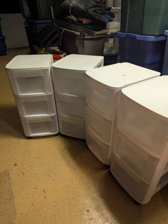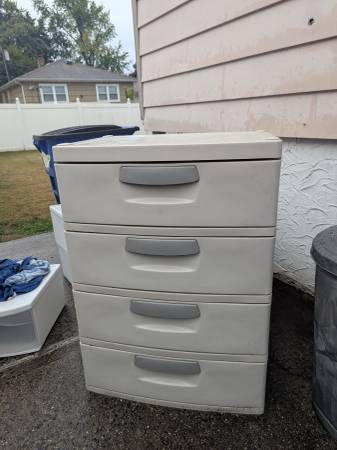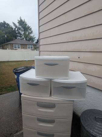 width: 18 length: 25 height: 35 Sturdy clean also included other Sterilite cabinets : 4 drawer $40; 3 smaller bin drawers $10 each and four 3 drawer narrow bins on wheels $15 each. Could be flexible