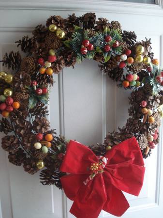 This is a 22 inch diameter Pinecone Wreath. It is Decorated with Bow, Candy Cane, Pinecones and Holiday Decorations. Please see pictures for details. Beautiful Christmas Wreath! Nicely Decorated....