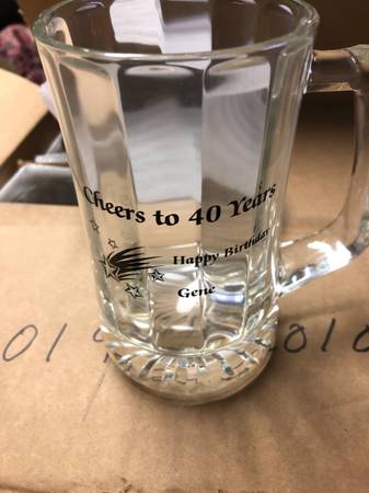 I have a case of 12 monogrammed 15oz glass beer mugs for sale. They say Happy 40th Birthday Gene. If interested email or text me at