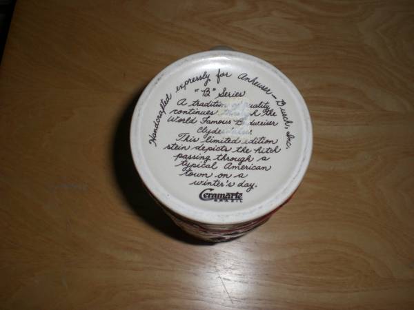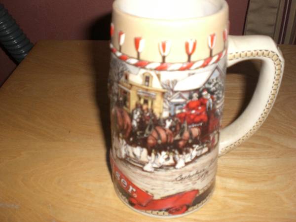 Budweiser Collector's Beer Stein $15.00 6-1/2" tall. Christmas theme. States on bottom: Handcrafted expressly for Anheuser-Busch, Inc. "B" Series A tradition of quality continues through the World...