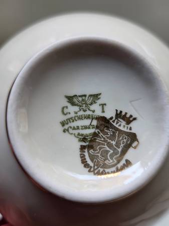 Full set of porcelain china dinner & cake plates, soup bowls, cups & saucers, coffee & cream pitchers. All in immaculate condition. Serves 8. Cash only. No shipping.