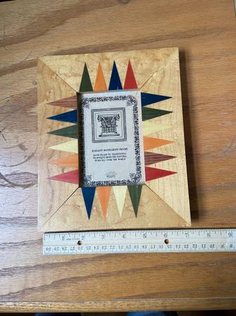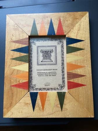 Elegant handicraft frame, hand-inlaid by traditional technique from natural wood all over the world. The frame is 7" x 8" and the picture it holds is 3" x 4 1/2". This frame is set up so that it can be hung horizontally or vertically, or it can stand on a flat surface. It's beautiful, colorful and unique.