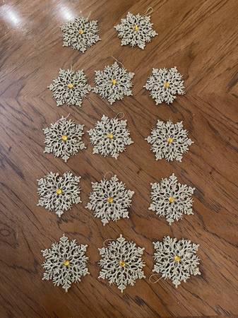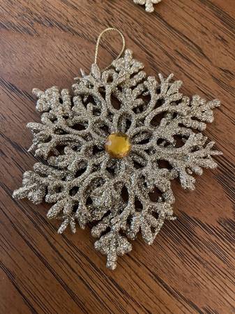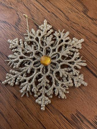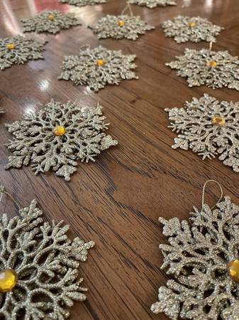 Lot of 14 Like New Gold Glittery Snowflake Ornaments with a Faux Orange Jewel in the Center of Each One