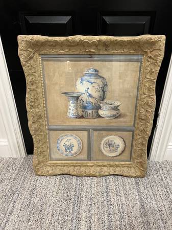 Large Blue & White Pottery Art in Rustic Frame. 25.5” x 30”. Frame is 2.5”d. Smoke free household.